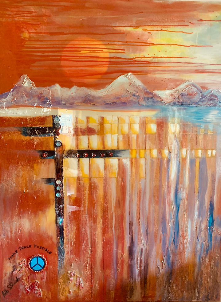 Painted in acrylics on raw canvas it feathures glass inlay with Spanish Moss, sand, shells , crystals and sparkles and mores; resin sealed. SOLD in Coral Gables February 24